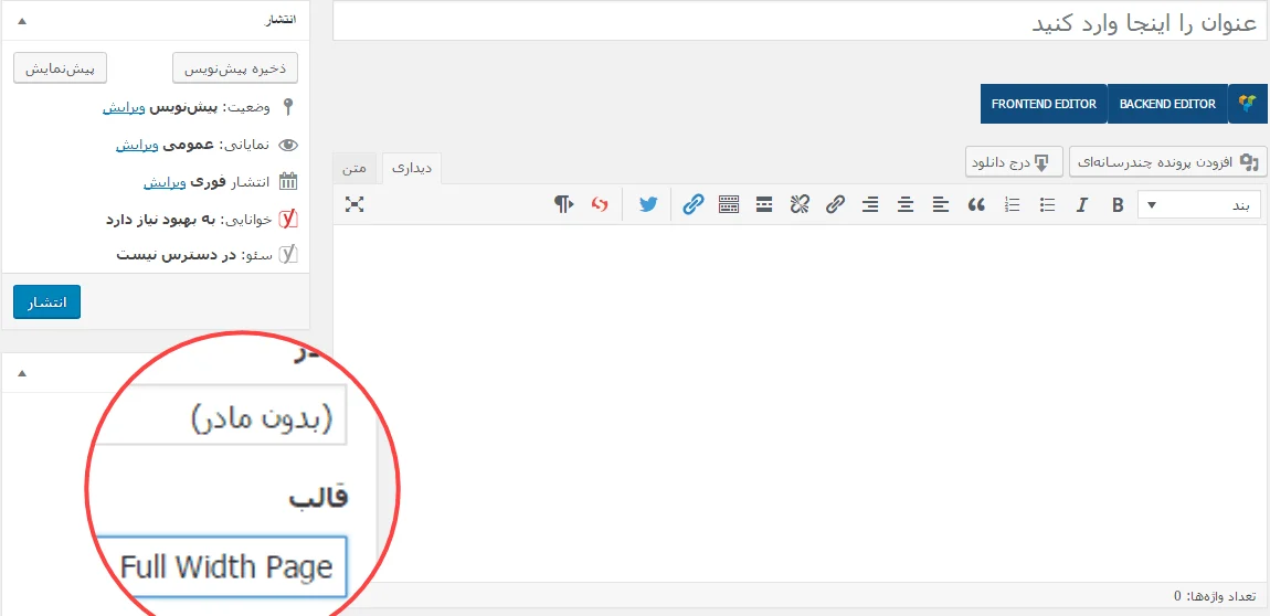 حال شما در فایل منیجر در پوشه فالب خود فایل full-width.php را آپلود کرده،و حال قالب شما به صورت پیش قرض در قسمت ویژگی برگه ها گزینه فالب full width نشان داده می شود و با انتخاب آن برگه را به روز رسانی کنید.